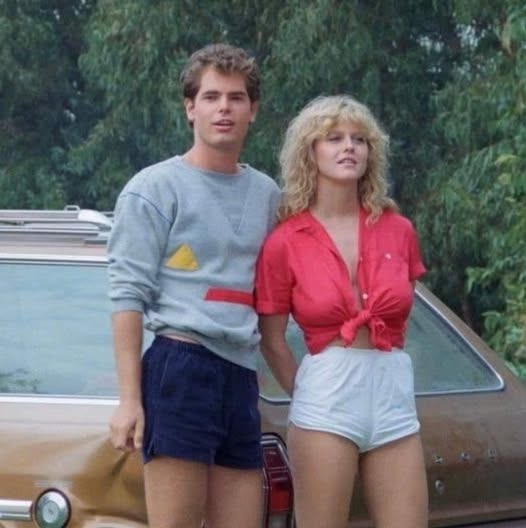 One memorable element of Evil Town is its nostalgic visual style. A well-known snapshot features lead actor Lynda Wiesmeier alongside her co-star, both dressed in iconic 80s fashion. He wears a gray sweatshirt with colorful shapes and dark shorts, while she sports a bright red shirt tied at the waist with high-waisted white shorts—perfectly capturing the era’s bold trends.