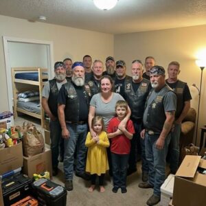 On a cold Tuesday morning, I stood in my doorway holding my four-year-old while my seven-year-old clung to my legs, trembling. The hallway echoed with boots as nearly thirty bikers…